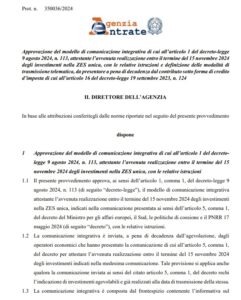 L’Agenzia delle entrate con il provvedimento n 350036/2024 del 9 settembre 2024 ha approvato il modello di comunicazione integrativa attestante l’avvenuta realizzazione entro il 15 novembre 2024 degli investimenti nella Zes unica.